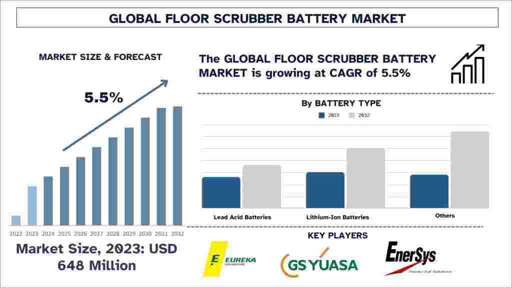 According to the UnivDatos, as highlighted in the Floor Scrubber Battery Market report, the global market was valued at USD 648 million in 2023 and is projected to grow at a CAGR of 5.5% during the forecast period (2024–2032). The global floor scrubber battery market has witnessed steady growth over recent years, driven by increasing awareness of clean, green, and energy-efficient cleaning solutions across commercial and industrial sectors.