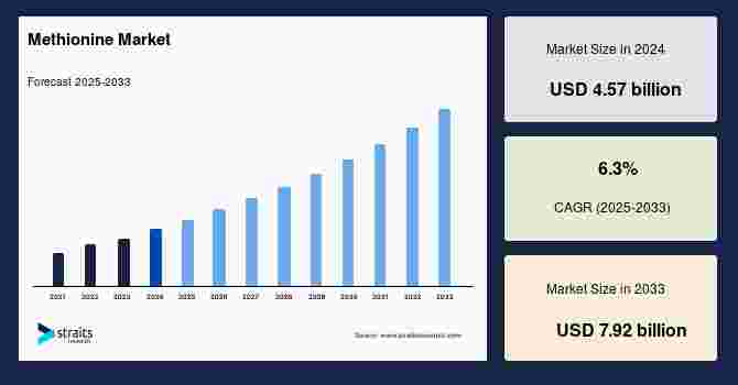 According to StraitsResearch, the global methionine market size is valued at USD 4.57 billion in 2024 and is estimated to reach USD 7.92 billion by 2033, growing at a CAGR of 6.3% during 2025-2033.