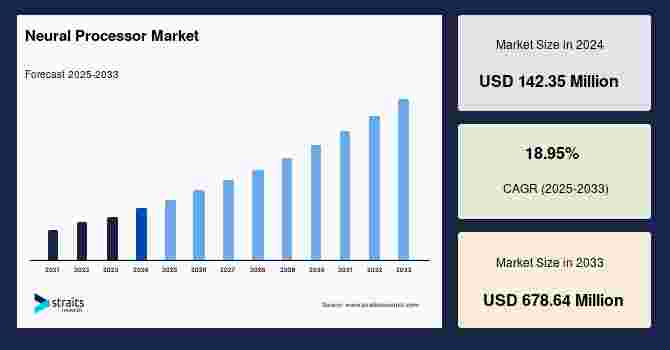 According to StraitsResearch, the global neural processor market size is valued at USD 142.35 million in 2024 and is estimated to reach USD 678.64 million by 2033, growing at a CAGR of 18.95% during 2025-2033.