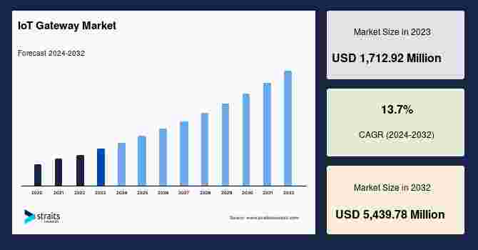 According to StraitsResearch, the global iot gateway market size is valued at USD 1,712.92 million in 2023 and is estimated to reach USD 5,439.78 million by 2032, growing at a CAGR of 13.7% during 2024-2032.