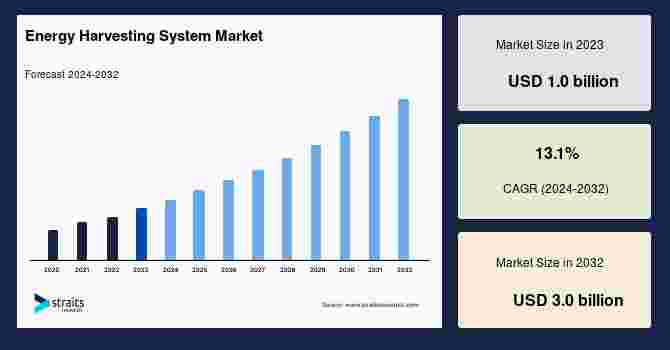 According to StraitsResearch, the global energy harvesting system market size is valued at USD 1.0 billion in 2023 and is estimated to reach USD 3.0 billion by 2032, growing at a CAGR of 13.1% during 2024-2032.