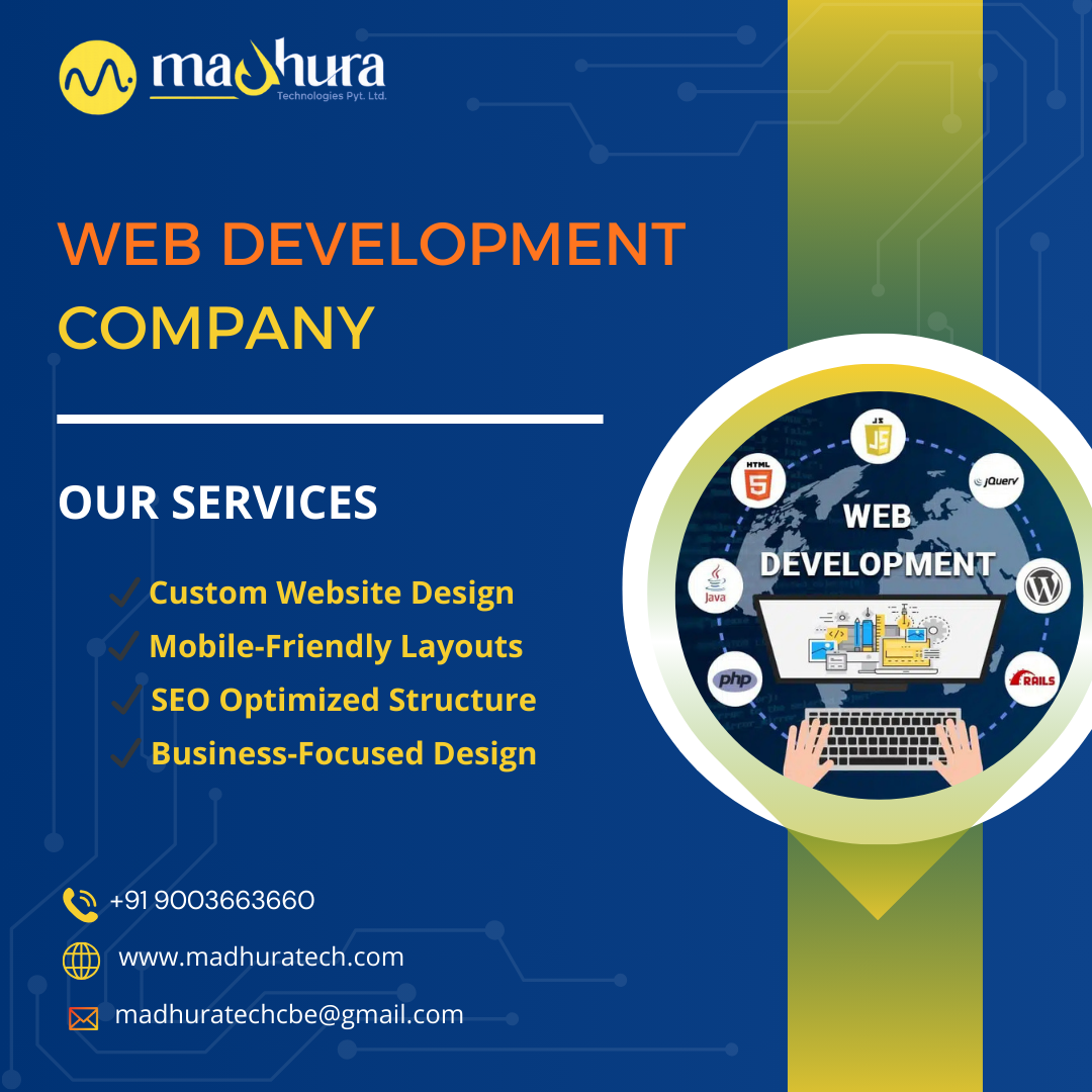 Drive your digital presence with Madhura Technologies, a leading website development company in Coimbatore. We craft responsive, modern, and feature-rich websites tailored to business needs. Our skilled team blends creativity and technology to deliver secure, scalable platforms that strengthen your brand identity, enhance user engagement, and support long-term online growth across every industry.