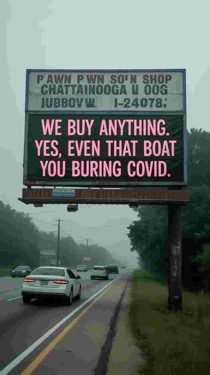 There it is. A giant sun bleached sign for a local pawn shop. The phone number is faded. The letters are slightly crooked but underneath the wear someone has hand painted a fresh message in hot pink: “WE BUY ANYTHING. YES, EVEN THAT BOAT YOU BOUGHT DURING COVID.”