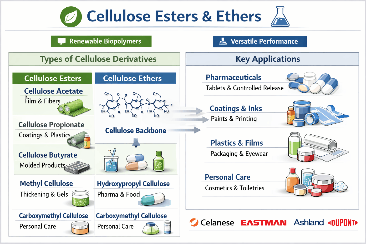 Eastman Chemical Company is one of the most commercially important cellulose derivatives producers serving the North American and global markets, with its Kingsport, Tennessee manufacturing operations producing cellulose acetate and specialty esters that serve pharmaceutical, personal care, and specialty coatings applications across demanding quality and regulatory compliance requirements. Its broad cellulose ester product portfolio and established pharmaceutical customer relationships create a competitive position that benefits from both technical expertise and long-standing supply relationship continuity.