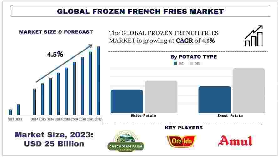 According to the UnivDatos analysis, the surge in innovative product launches as per consumer demand and the rising trend of ready-to-eat food will drive the global scenario of the frozen French fries market. As per their “Frozen French Fries Market” report, the global market was valued at ~USD 25 billion in 2023, growing at a CAGR of about 4.5% during the forecast period from 2024 - 2032 to reach USD billion by 2032.
