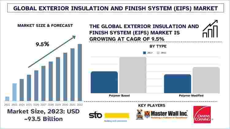 According to the UnivDatos, increasing demand for energy-efficient building solutions and rising adoption of green building practices and certifications, growth in residential and commercial construction activities, and technological advancements in EIFS, including fire resistance and moisture management drive the Exterior Insulation and Finish System (EIFS) market. As per their “Exterior Insulation and Finish System (EIFS) Market” report, the global market was valued at USD 93.5 Billion in 2023, growing at a CAGR of about 9.5% during the forecast period from 2024 - 2032.