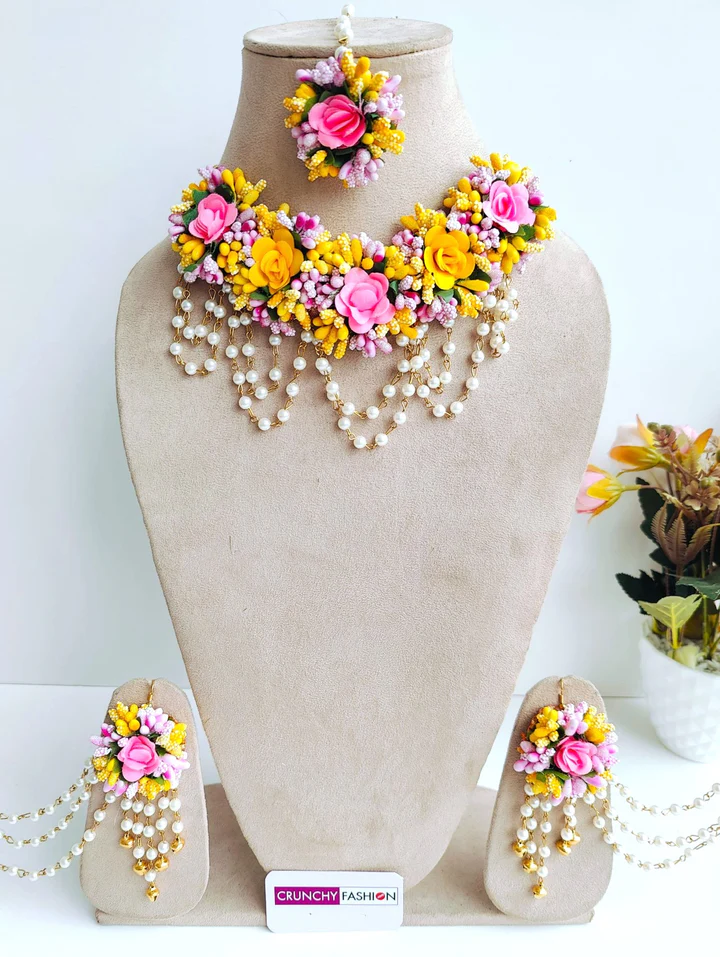 Bridal celebrations today feel brighter, fresher, and more personal than ever—and nothing captures this new-age charm better than Flower Jewellery Sets for Haldi-Mehndi. These delicate accessories have become a must-have, not just for the bride but also for bridesmaids, friends, and family members who want to add a burst of floral grace to pre-wedding ceremonies.
