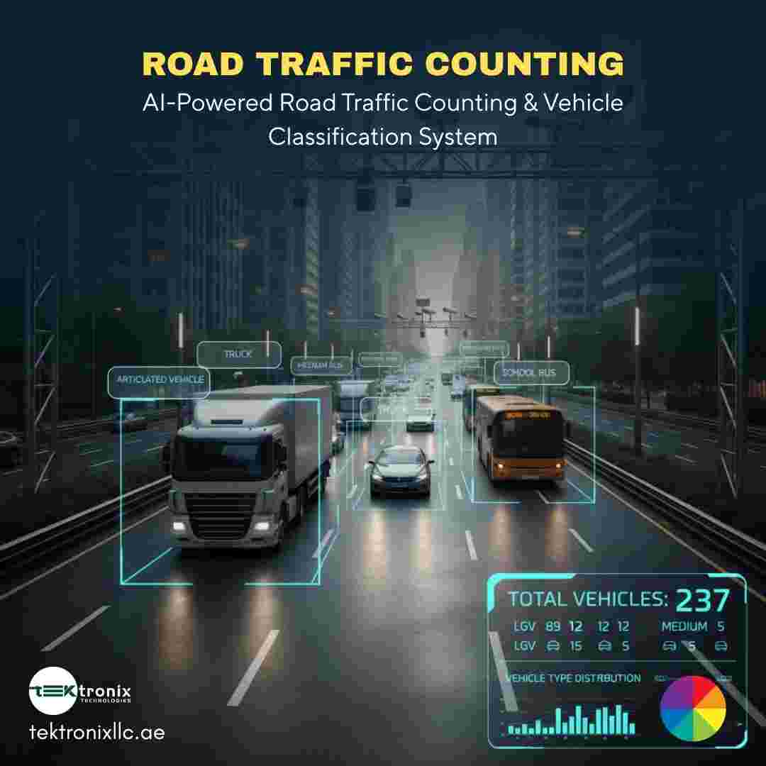 AI-Powered Traffic Surveys Transform UAE Smart Road InfrastructureSmart Traffic Surveys Powering UAE's Road Vision 2030AI-powered traffic surveys transform the way the UAE develops and operates the road infrastructure. The accuracy of traffic counting as well as detailed traffic flow analysis offer real-time insight of road use. Intelligent vehicle counting as well as automated traffic data collection removes manual mistakes. Advanced traffic analysis solutions supported by traffic surveillance generate reliable traffic statistics to help plan long-term. By using accurate urban traffic tally authorities will be able to decrease congestion, improve safety and enhance mobility. These advancements are crucial for creating smarter, more secure better-performing UAE roads.📞 For more information, contact us:🏢 Tektronix Technology Systems Dubai – Head Office📧 connect@tektronixllc.ae📱 +971 50 814 4086📱 +971 55 232 2390📍 Office Address:Office No.1E1 | Hamarain Center132 Abu Baker Al Siddique Rd – Deira – Dubai📮 P.O. Box 85955