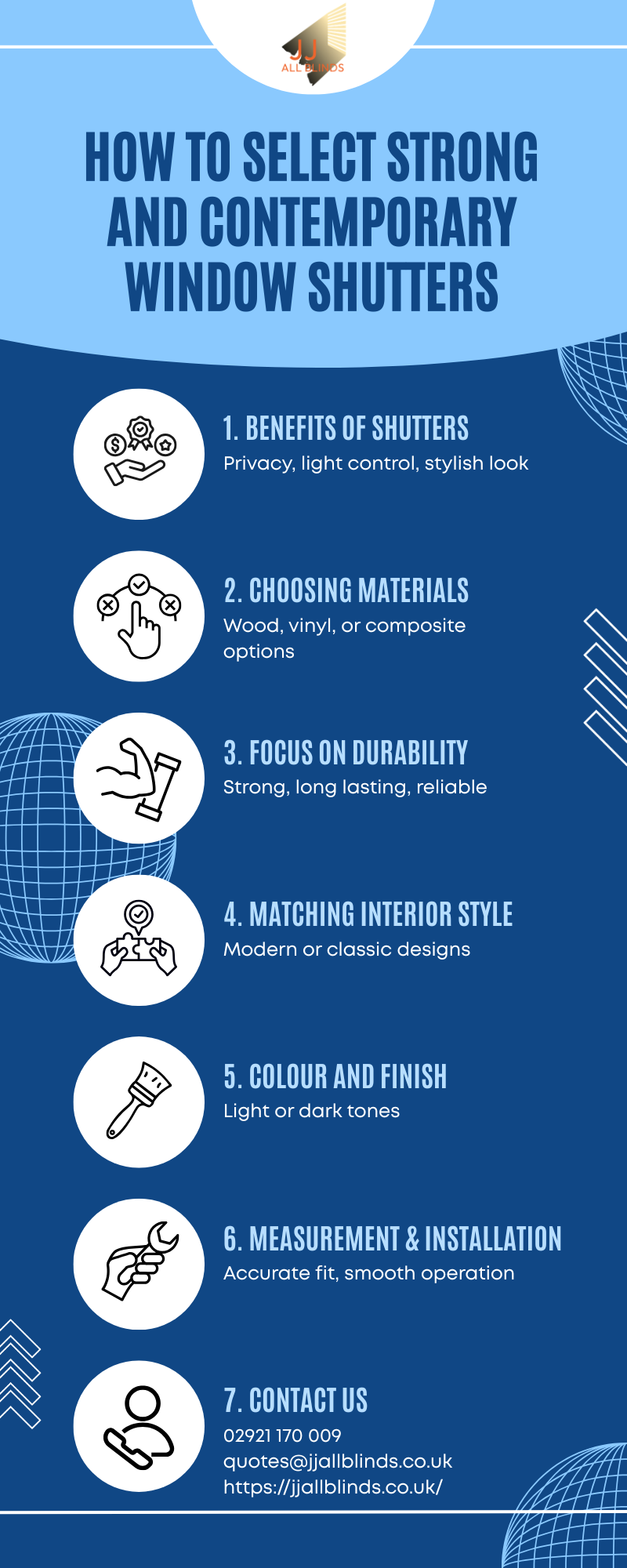 JJ ALL BLINDSThis infographic highlights the key steps to choosing window shutters that offer each durability and a current appearance. It covers important factors consisting of materials, design choices, colour choice, and proper installation. By following those guidelines, house owners can select shutters that provide long term overall performance even as keeping a clean and stylish indoors look.Visit Our Site: https://jjallblinds.co.uk/